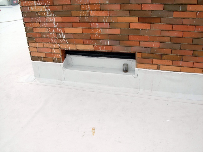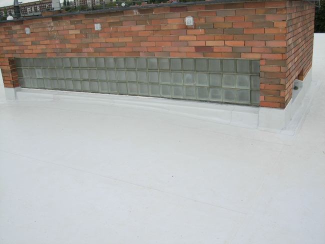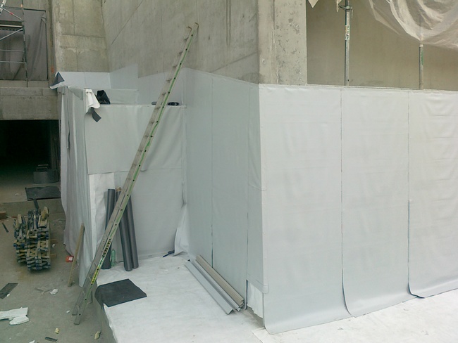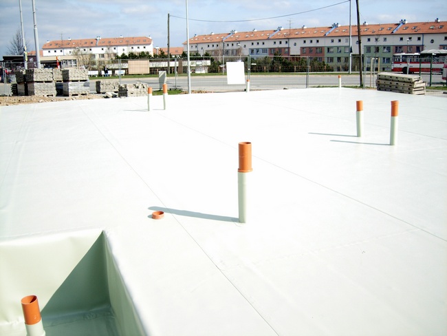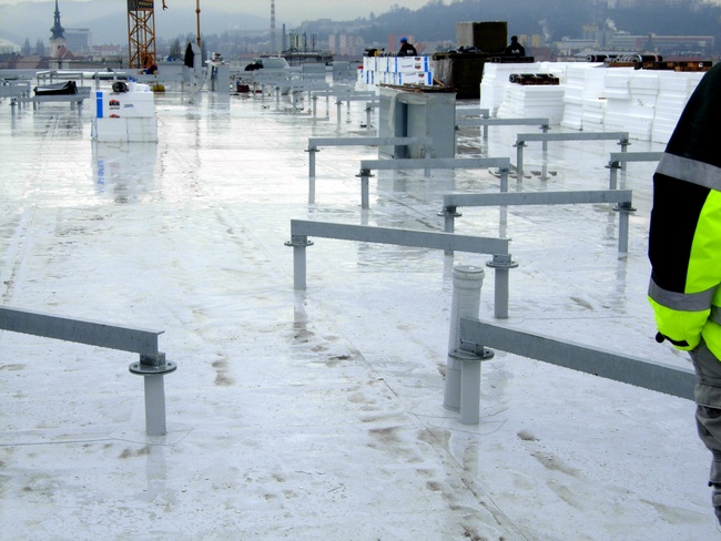 Justiční palác Brno-město: Na fotce můžete vidět ruční svařování pomocí horkovzdušné pistole "Leister". Tato technologie se používá ke spojení PVC materiálů používaných jako konečná hydroizolační vrstva. Celkové souvrství bude vidět na další fotce.