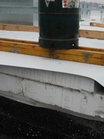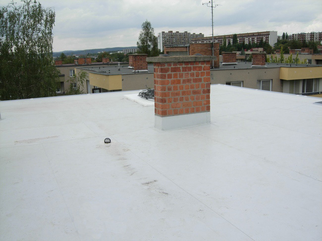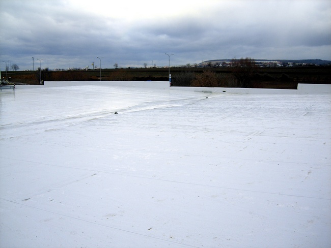 Celkový průřez souvrstvím tepelné izolace a hydroizolace. Tuto práci jsme prováděli na budově Justičního paláce pro Brněnské izolace. Můžete vidět spádování polystyrenovými klíny. Tato technologie se používá k docílení spádu na rovném podkladu k lepšímu odvedení vody. Jako parotěsná vrstva bylo použito celoplošně natavených asfaltových pásů.