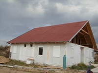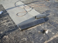 Příprava na celoplošné natavení asfaltových pásů na budově Policie ČR v Hustopečích. Natavení modifikovaných asfaltových pásů se provádí pomocí plamene.